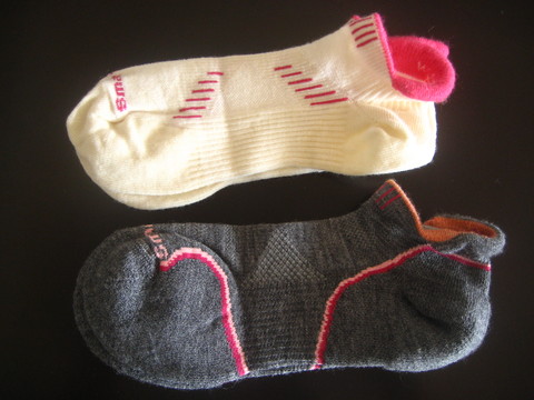 ランニングライトとアウトドアライトはどちらもつま先、カカト、足裏にクッションのあるタイプ。このクッション性は気持ちいいです。これまで持っていた別のメーカーのは全体がモコモコしていたので靴下としてはいいけど、シューズがきつくなるのが困りものでした。スマートウールのは足の甲部分は薄いのでサイズアップはそれほどないのがいい。
