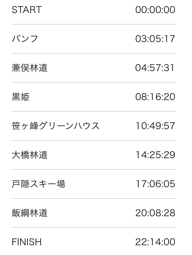 ベストスコアでも間に合ってないのだけど、計画していた各エイドでのタイムはまさにこんな感じでした。